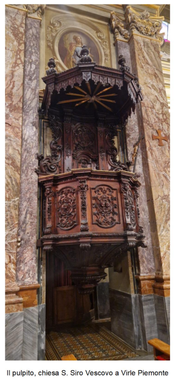 Dalle ore 14,30 alle ore 17,30, sarà aperta la chiesa parrocchiale San Siro Vescovo di Virle Piemonte, a cura dei Volontari dei Beni Culturali dell’Associazione Turistica “Basso Lemina”. La chiesa è un interessante edificio barocco progettato dall’architetto Antonio Maria Lampo, che custodisce gli straordinari apparati lignei (pulpito, cantoria, cassa dell’organo) commissionati da Emanuele Filiberto principe di Savoia-Carignano a fine ‘600 per la chiesa Santa Chiara di Carignano e trasportati a Virle dopo la demolizione della chiesa carignanese.